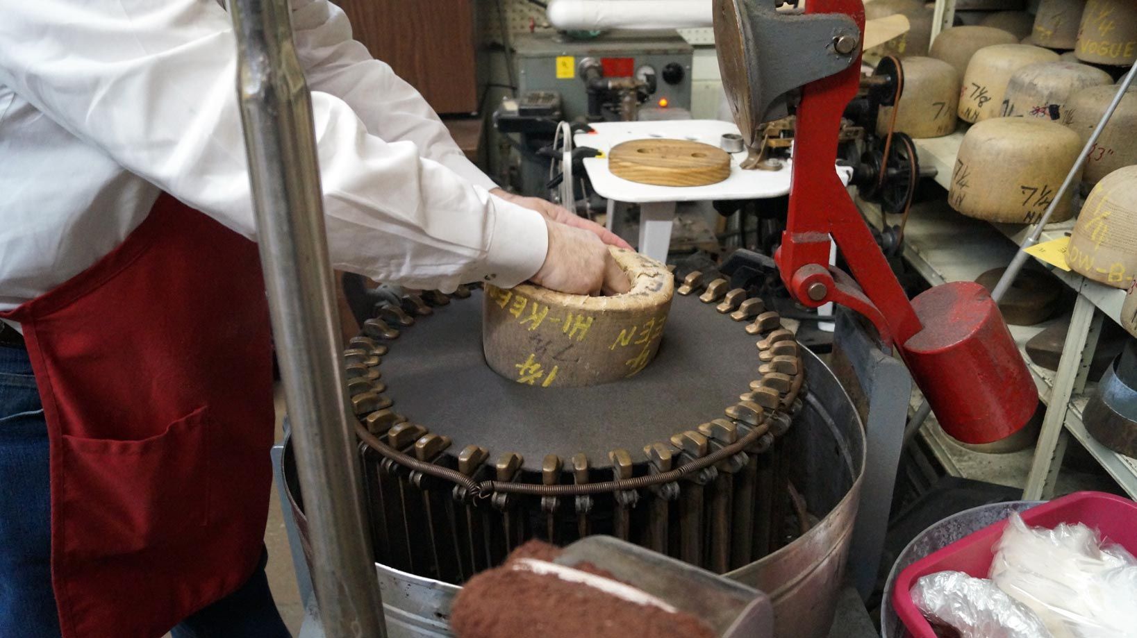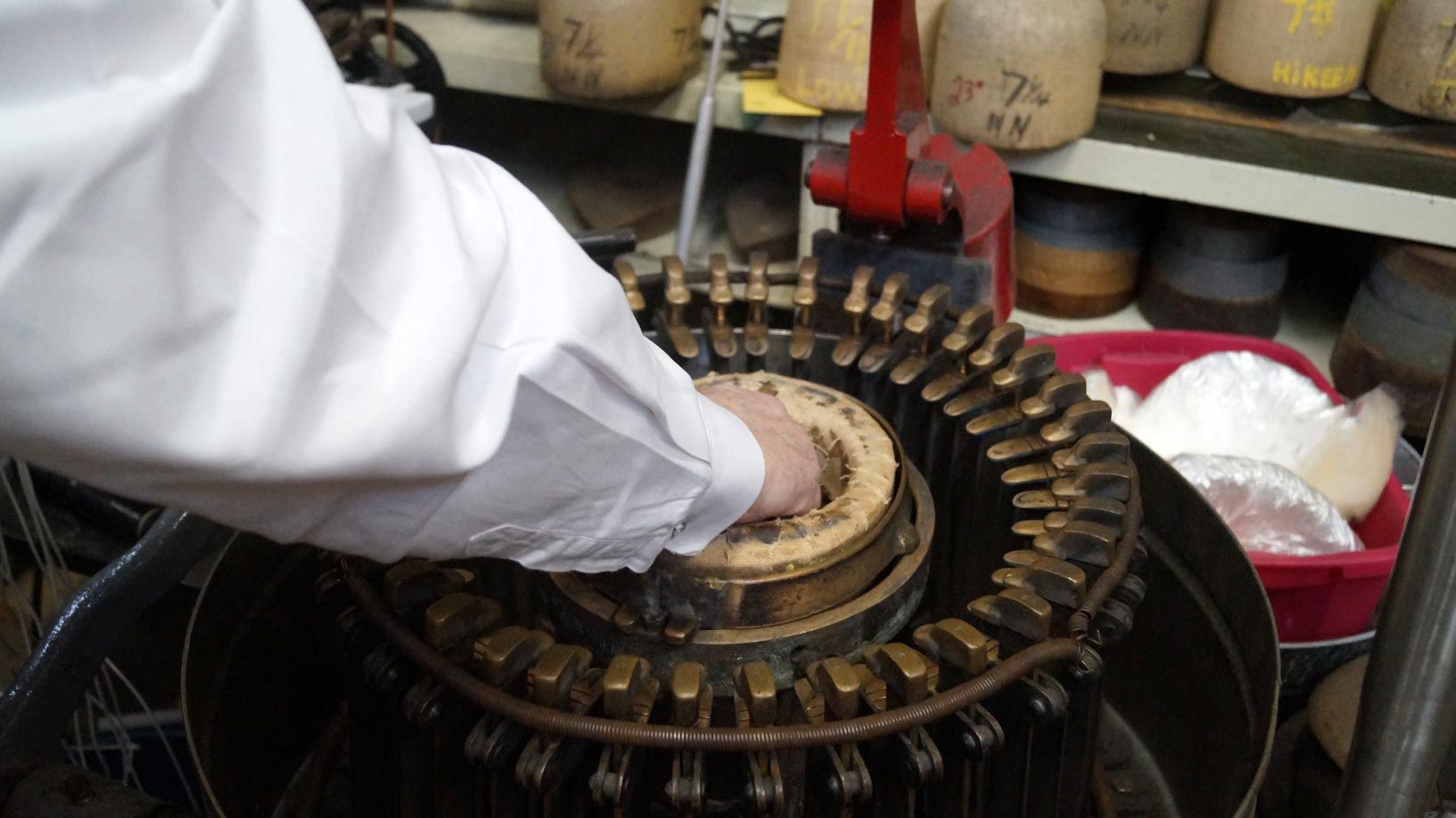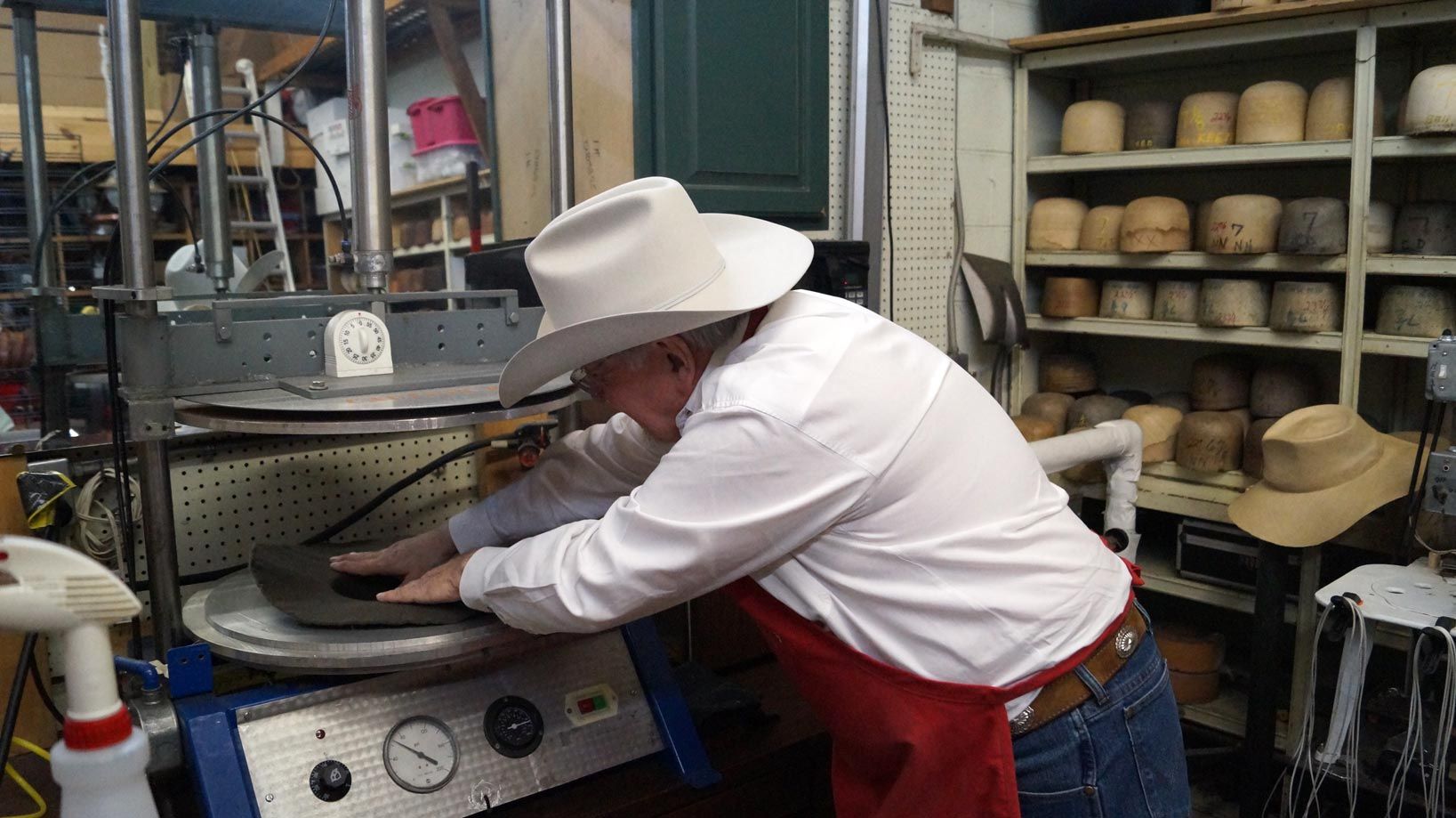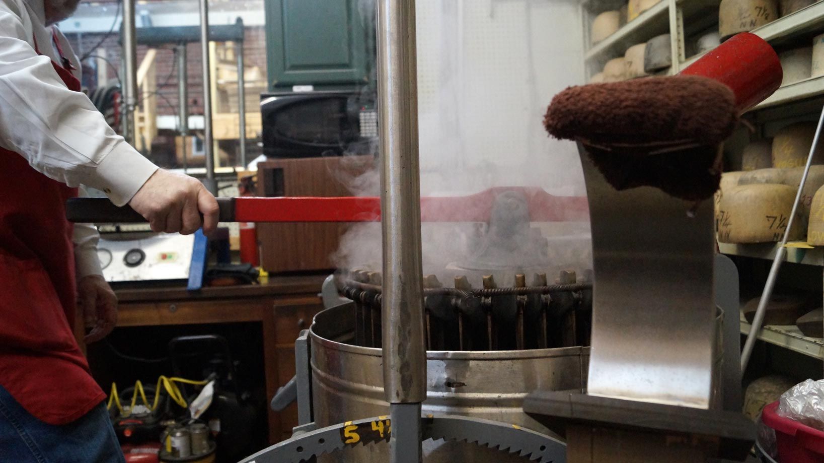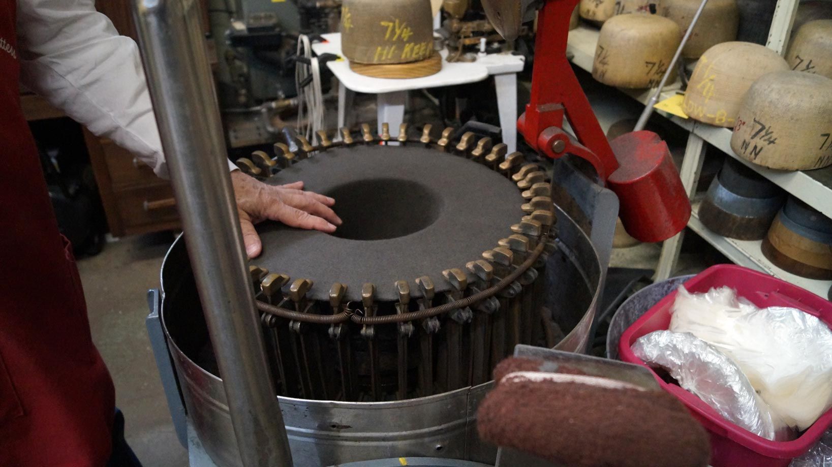 As the finger blocker presses the block, the steam softens the hat fibers and allows the hat to take the shape of the chosen block.