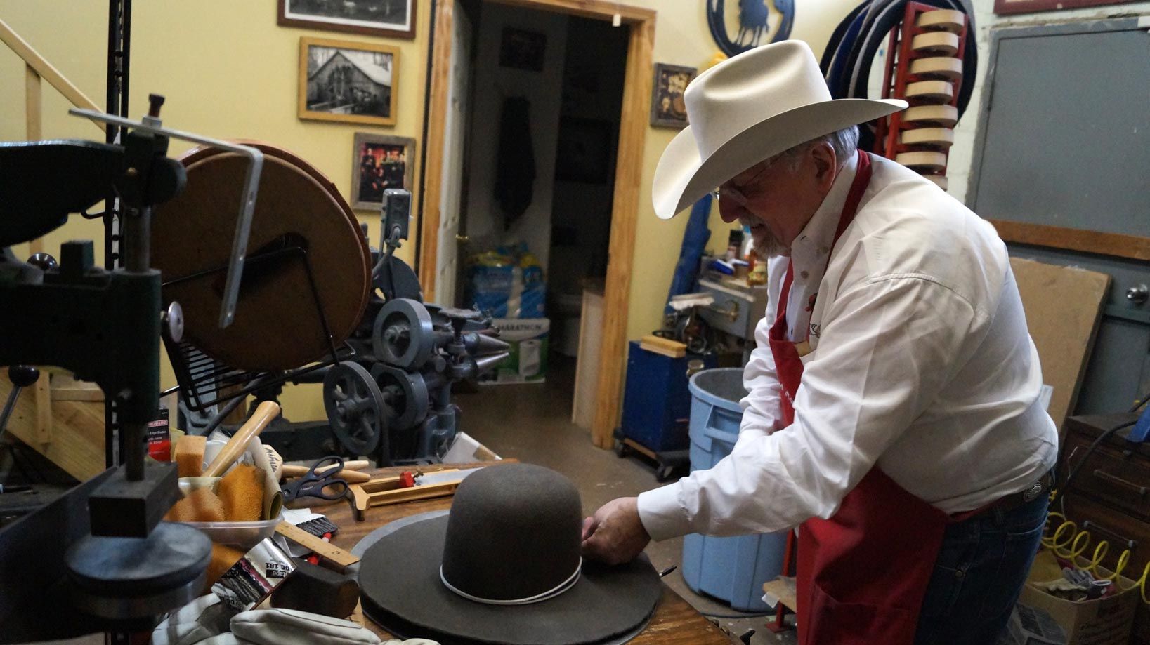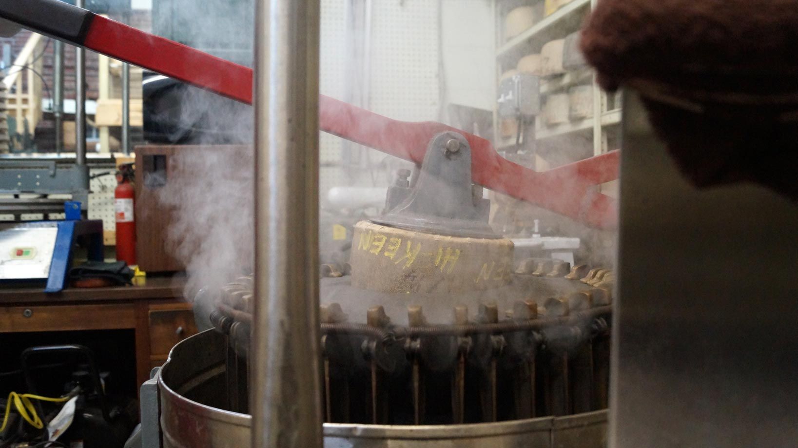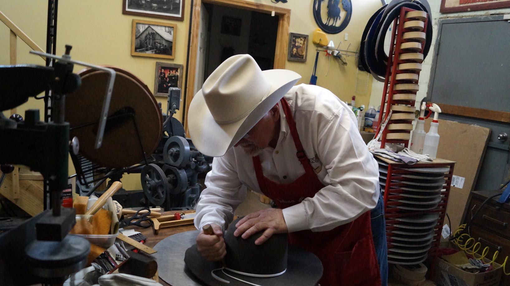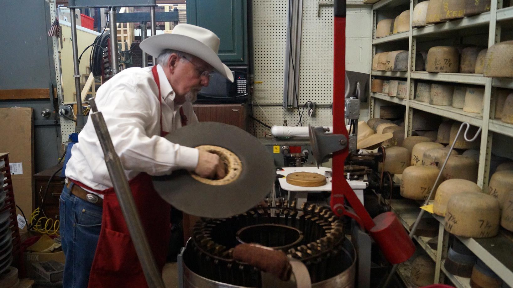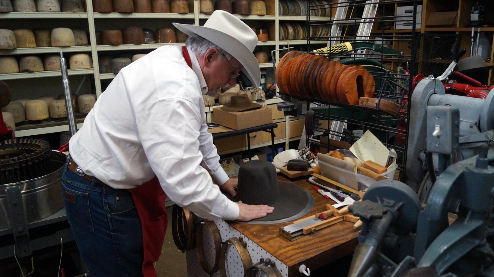 As the finger blocker presses the block, the steam softens the hat fibers and allows the hat to take the shape of the chosen block.